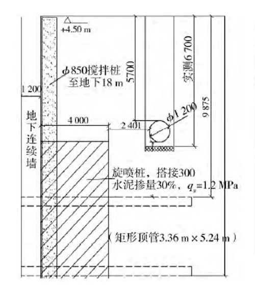 为确保顶管机出洞的绝对安全,需对后靠土体及进、出洞区域土体进行高压旋喷桩加固。2#出入口始发井基坑围护采用厚800mm地下连续墙,始发井洞口加固采用φ1000mm@700mm三重管高压旋喷桩,水泥掺量30%,加固范围为顶管以上3m、以下5m,顶管左右各3m,加固宽度为4m,加固后土体28d龄期无侧限抗压强度不小于1.2MPa;后靠加固采用φ1000mm@800mm三重管高压旋喷桩,水泥掺量30%,加固范围为顶管以上5m、以下6m,顶管左右各5m,加固宽度为4m,加固后土体28d龄期无侧限抗压强度不小于1.2MPa;接收井即12号线漕宝路站车站主体,基坑围护采用厚1200mm地下连续墙,洞口加固采用垂直水泥土加固辅助水平冰冻法,垂直水泥土加固平剖面同始发井洞口加固。