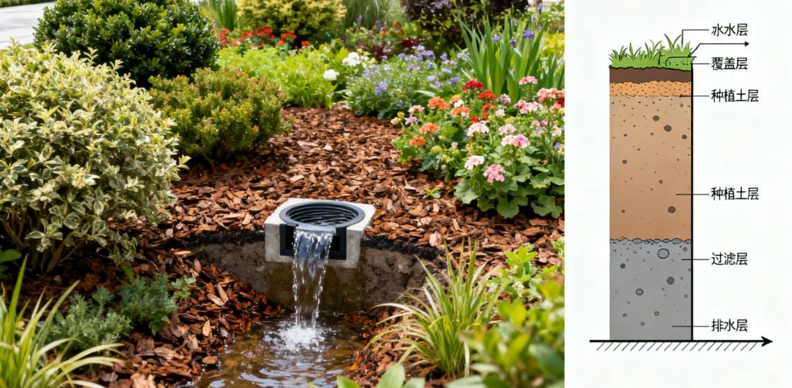 海绵城市是指城市像海绵一样,在适应环境变化和应对自然灾害等方面具有良好的 “弹性”,下雨时吸水、蓄水、渗水、净水,需要时将蓄存的水 “释放” 并加以利用。其核心目标是:将 70% 以上的降雨就地消纳和利用,削减雨水径流峰值 30% 以上,城市内涝积水时间控制在 1 小时以内。